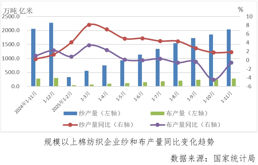 2025年1-11月份,规模以上纱产量为2039.7万吨,同比增长1.84%,增速较1-10月份加快0.1个百分点,规模以上布产量为278.3亿米,同比下降0.55%,降速较上月累计收缩3.95个百分点。