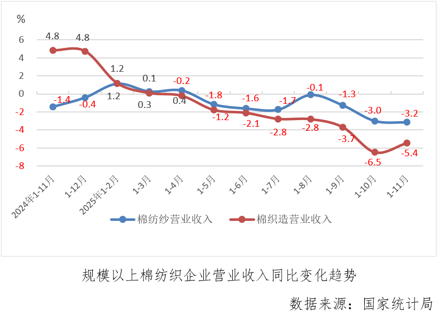 2025年1-11月份,规模以上棉纺织企业营业收入同比下降3.9%,连续7个月累计下降,降幅较上月累计小幅收缩0.3个百分点,其中棉纺纱和棉织造下降幅度分别为3.2%和5.4%,棉纺纱较上月累计扩大0.2个百分点,棉织造较上月累计收缩1.0个百分点。