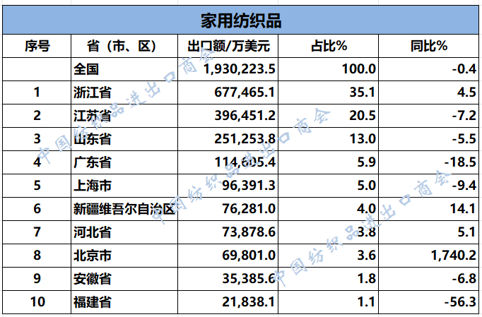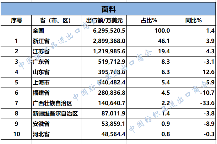 2025年1-11月纺织服装类重点商品出口前十名的省(市、区)