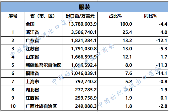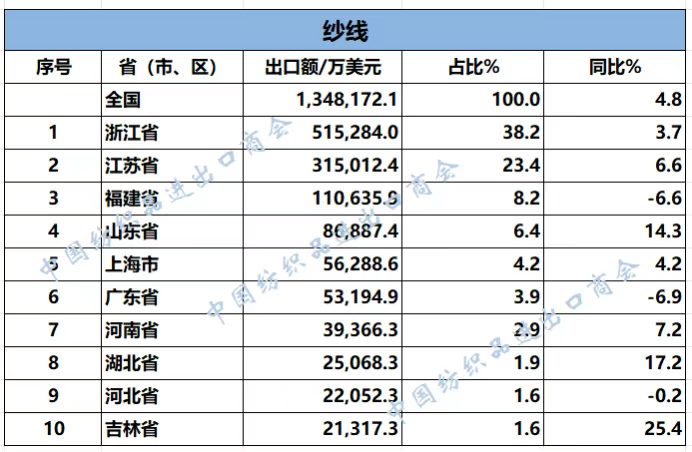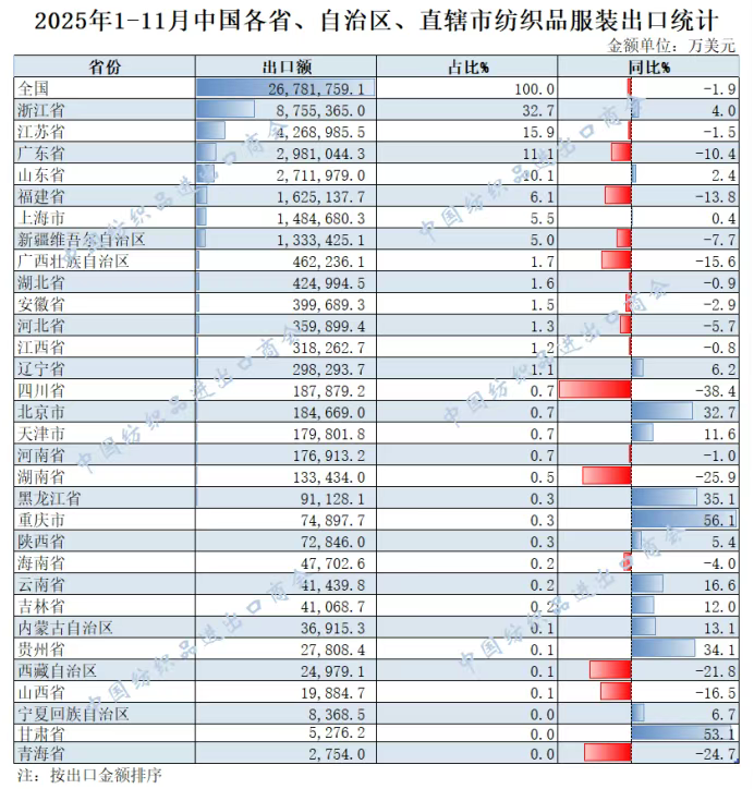 2025年1-11月,我国纺织服装累计出口2678.18亿美元,同比下降1.9%。浙江省、江苏省、广东省、山东省、福建省分别列全国纺织服装出口省市前五位,合计比重超七成。