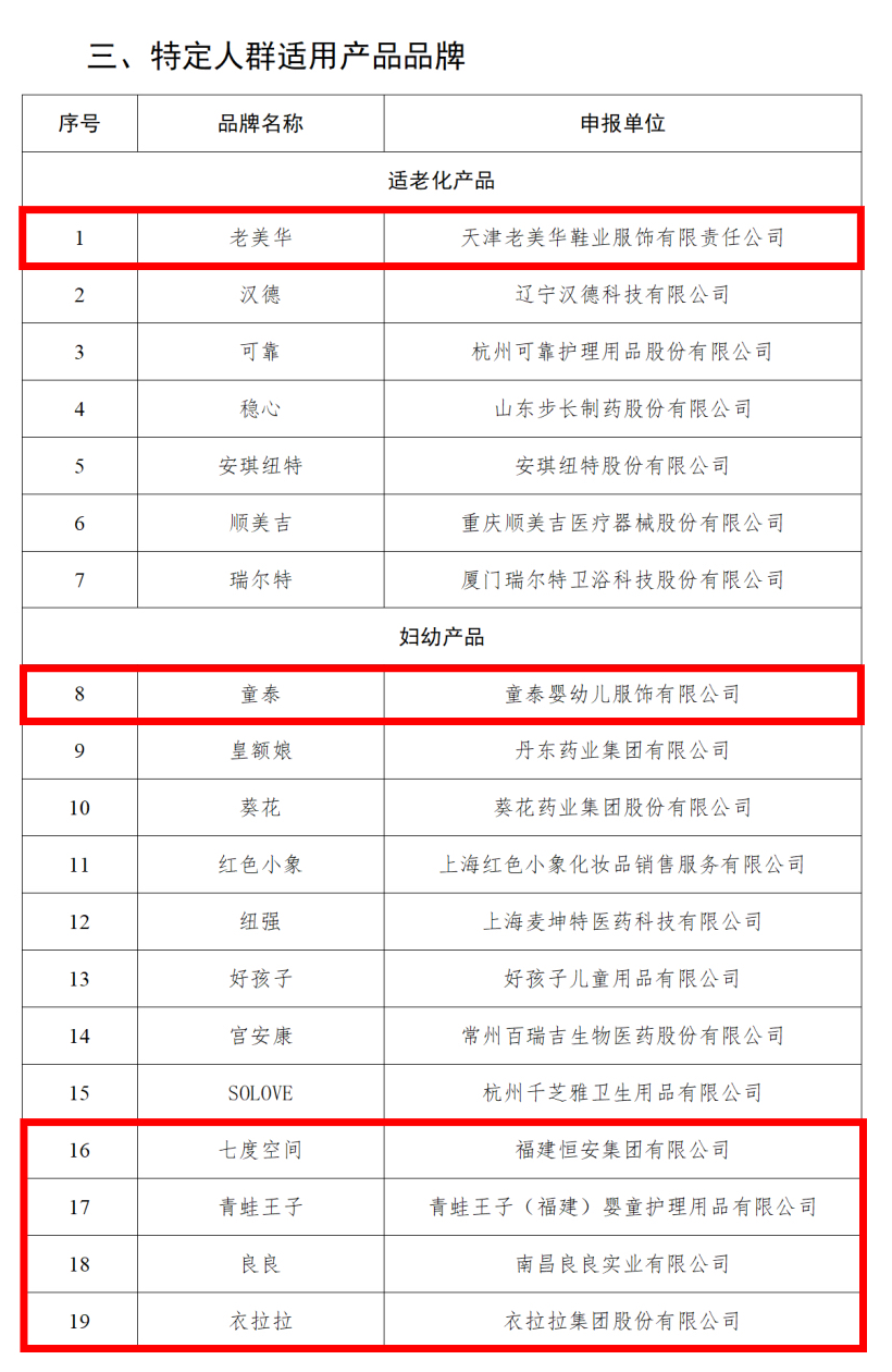 特定人群适用产品品牌中,老美华、可靠入围“适老化产品”类,童泰、好孩子、SOLOVE、七度空间、良良、衣拉拉、自由点、爱布等品牌入选“妇幼产品”类,体现了纺织名品在满足不同群体品质消费需求上的精准发力。