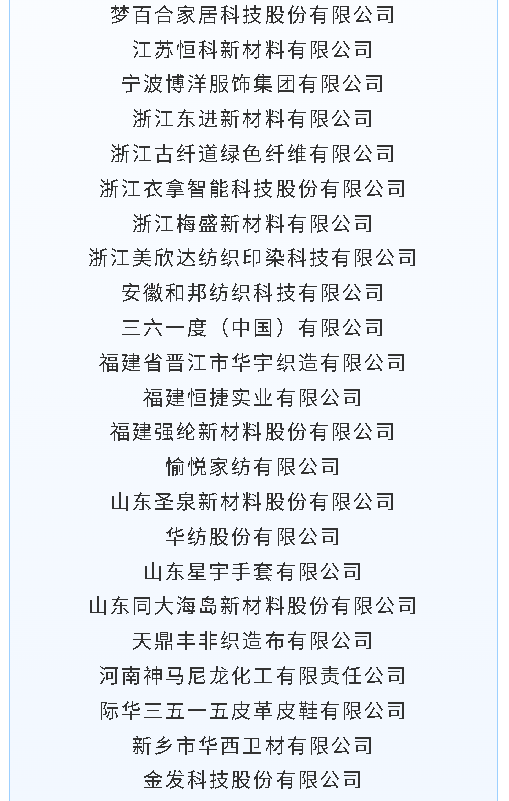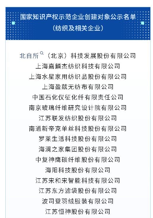 此次入围的纺织及相关企业覆盖产业链各关键环节,既有海澜之家、波司登、三六一度等知名品牌企业,也有中复神鹰碳纤维、浙江古纤道绿色纤维等细分领域龙头,以及南京玻璃纤维研究设计院、北自所(北京)科技发展等科技型企业,充分体现了纺织行业知识产权布局的多元化与高质量特征。