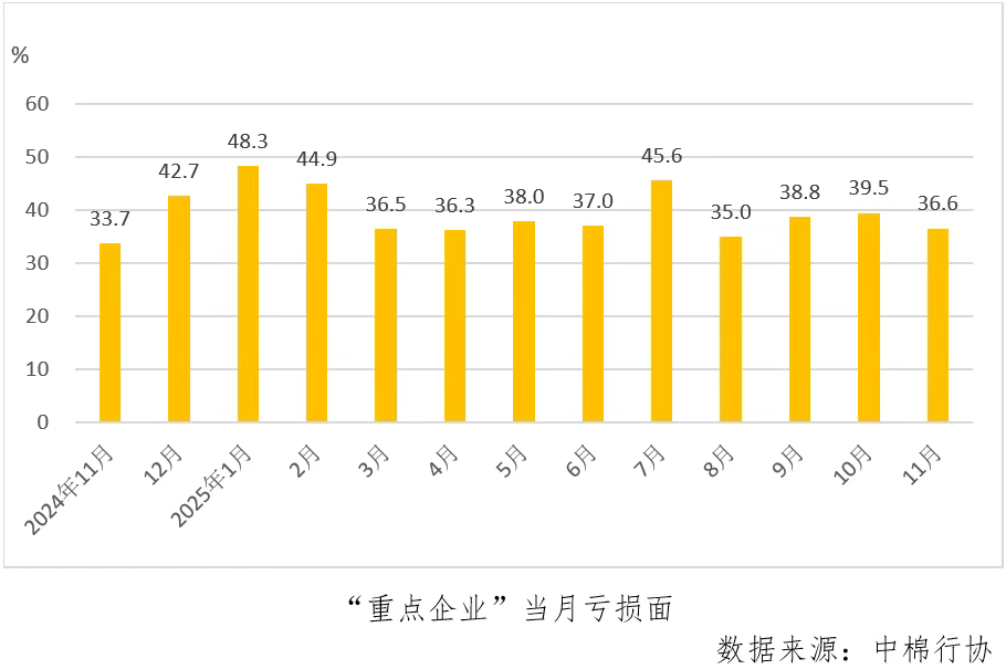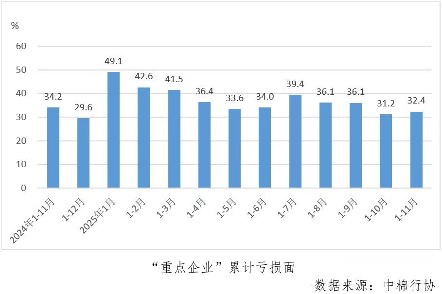 1-11月份,“重点企业”累计亏损面为32.4%,较1-10月份扩大1.1个百分点。11月份当月亏损面为36.6%,较10月份收缩2.9个百分点。