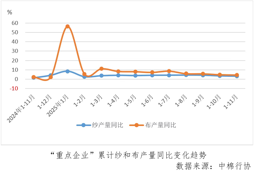 1-11月份,“重点企业”纱产量同比增长3.1%,布产量同比增长4.5%,均较1-10月份增速放缓0.3个百分点。11月份当月纱产量环比增长2.8%,布产量环比增长8.5%,均由上月环比下降转为增长。