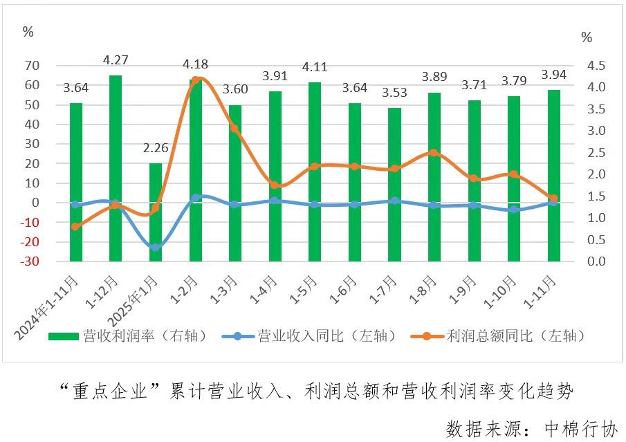 据中国棉纺织行业协会跟踪的重点企业(以下简称“重点企业”)数据, 1-11月份,“重点企业”营业收入同比增长0.2%,较1-10月份由降转增,利润总额同比增长1.8%,较1-9月份增速下滑12.3个百分点,营收利润率为3.94%,较1-10月份扩大0.15个百分点。