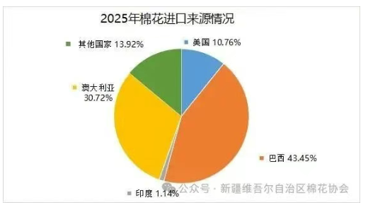 从进口来源结构看,2025年进口来源格局进一步调整,呈现一强多元的态势。巴西棉因产量增长及价格优势明显依然备受青睐,累计占比超出43%,稳居第一来源国。澳大利亚占比回升,约占31%,主要因高品质棉需求及双边贸易协定的推动。美国占比份额仅有11%,较往年明显收缩,受中美贸易关系、美棉价格及航运等因素影响。
