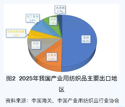 2025 年我国产业用纺织品对全球主要市场的出口表现呈现显著分化态势。亚洲是我国产业用纺织品最大的出口地区,占出口总额的50.3%,全年对该地区的出口额同比增长1.5%;我国对第二大出口市场北美地区的出口额同比下降8.9%,市场份额较2024年下滑1.4个百分点;对欧盟市场和拉美市场的出口额分别同比增长3.8%和5.3%,市场份额较2024年分别提升0.2个百分点和0.4个百分点;非洲市场的增长动能最为强劲,出口额同比增长11.6%,市场份额提升幅度居各主要市场之首,达到7.9%;对大洋洲的出口额同比下降1.2%,市场份额较2024年下滑0.1个百分点(如图2)。
