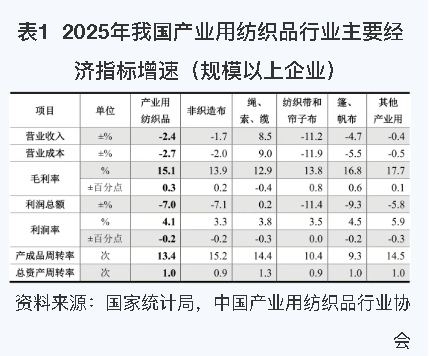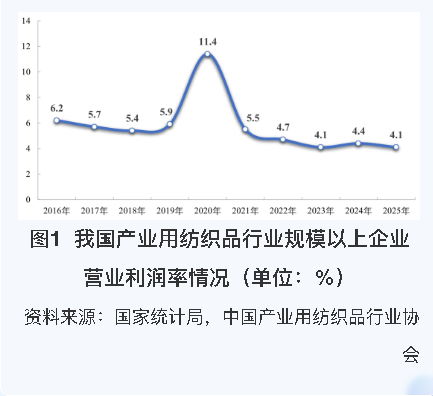 根据国家统计局数据,2025年产业用纺织品行业规模以上企业(非全口径)的营业收入与利润总额分别同比下降2.4%和7.0%;行业毛利率为15.1%,较2024年提升0.3个百分点,营业利润率为4.1%,较2024年回落0.2个百分点(如图1)。