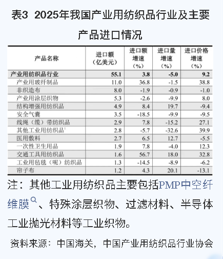 根据中国海关数据,2025年,我国产业用纺织品行业的进口额(海关8位HS编码统计数据)为55.1亿美元,同比增长3.8%,自2021年以来首次恢复正增长。