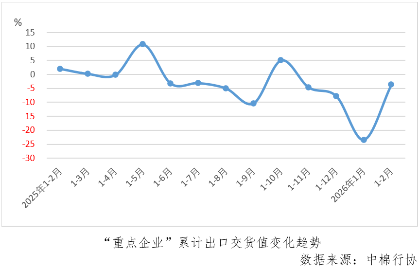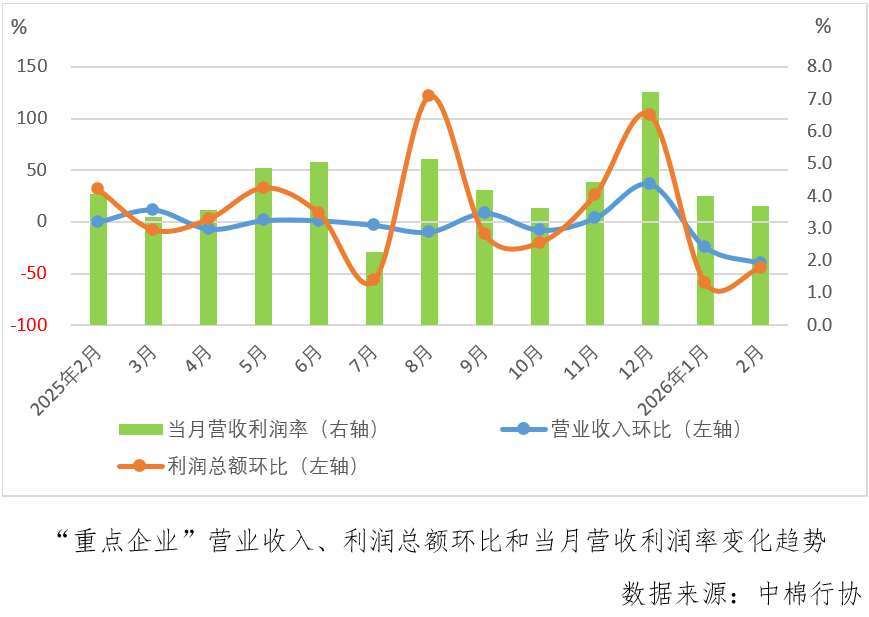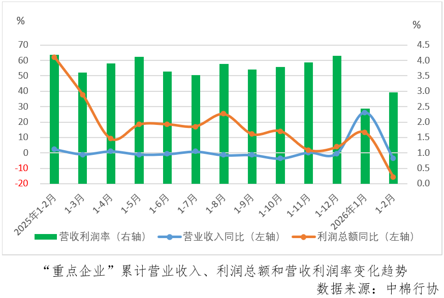 据中国棉纺织行业协会跟踪的重点企业(以下简称“重点企业”)数据, 2026年1-2月份,“重点企业”营业收入同比下降3.7%,利润总额同比下降15.5%,利润总额降幅显著高于营业收入,使得营收利润率低于上年同期1.22个百分点降至2.96%。