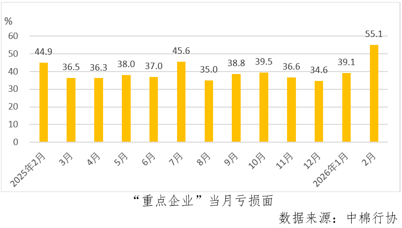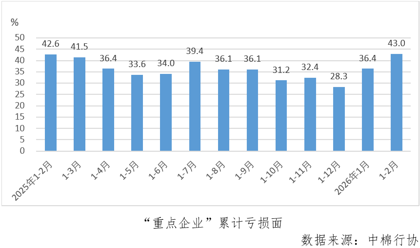 2026年1-2月份,“重点企业”累计亏损面为43.0%,累计亏损面升至近一年来月度累计最高点,且高于上年同期0.4个百分点。2026年1月份亏损面为36.4%,超过1/3企业亏损,2月份亏损面急升至55.1%,超半数企业亏损。