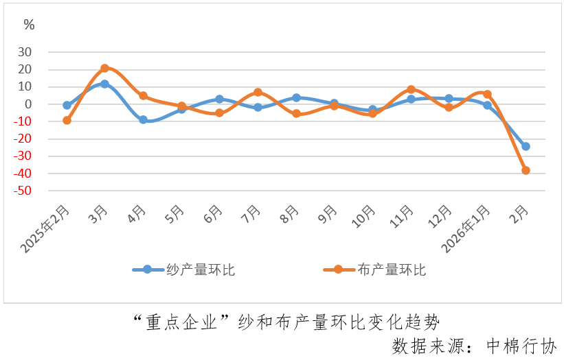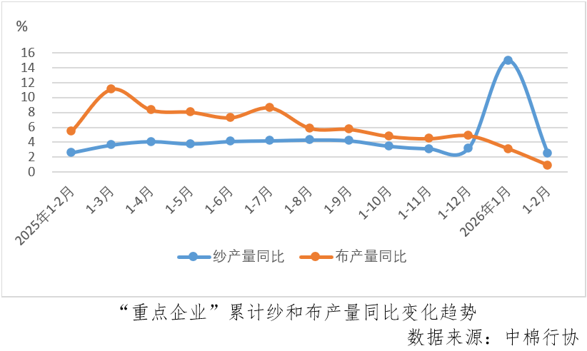 2026年1-2月份,“重点企业”纱产量同比增长2.5%,布产量同比增长0.9%。2026年1月份,“重点企业”纱产量环比微降0.8%,布产量环比增长5.4%,2月份恰逢春节假期,“重点企业”纱产量和布产量环比分别下降24.5%和38.2%。