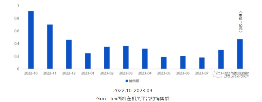 Gore-Tex面料的冲锋衣在淘宝天猫平台的市场份额为9.9%,其中,较为有代表性的一款使用了Gore-TEX科技的冲锋衣为始祖鸟旗下的硬壳冲锋衣防风外套,自2022年10月至2023年9月的销售额环比增长了160.1%。