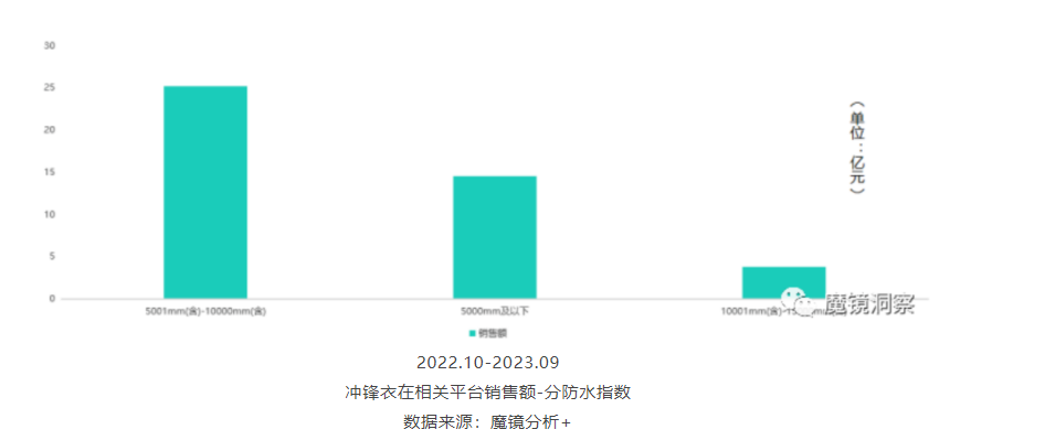 根据魔镜分析+数据,自2022年10月至2023年9月,市面上销售额较高的冲锋衣的防水指数在5001mm至10000mm之间,防水性能处于中等区间,该防水指数区间的冲锋衣的均价在583元左右,其在淘宝天猫平台的市场份额为55.3%。防水指数在10001mm至15000mm的冲锋衣相对来说防水性能较好,可以应对相对来说更为恶劣的天气,专业性能更强。